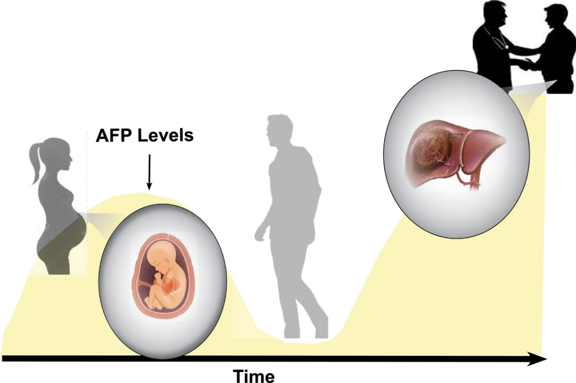 當(dāng)人肝組織發(fā)生癌性惡變或良性再生時(shí),甲胎蛋白的基因會(huì)被再次激活而高度表達(dá),并且隨著肝細(xì)胞受損程度的加重,AFP水平急劇升高(圖1)。肝癌患者的肝癌細(xì)胞能合成并分泌AFP,因此AFP是肝細(xì)胞癌篩查或監(jiān)測的重要腫瘤標(biāo)志物。其他類型的腫瘤,包括胃癌、卵黃囊腫瘤、胰腺癌、肺癌以及生殖細(xì)胞腫瘤中也能觀察到AFP水平升高的現(xiàn)象。